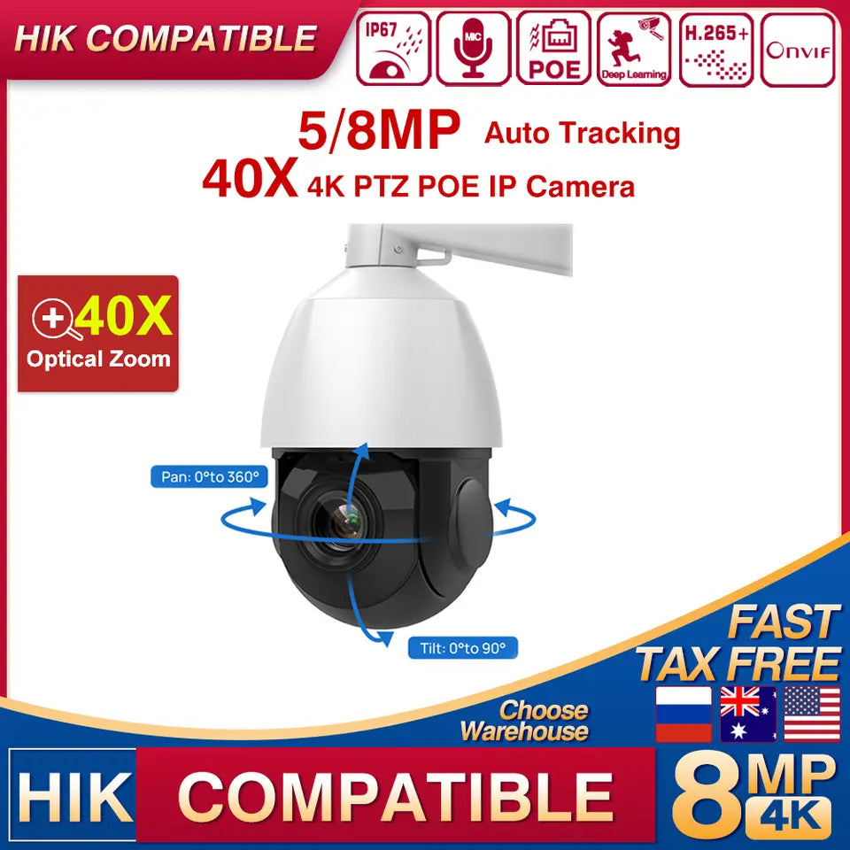 Hikvision Compatible 4K 40X Zoom 8MP PTZ IP Camera PoE Auto Track Human Vehicle Detection Two Way Audio SD Surveillance Camera